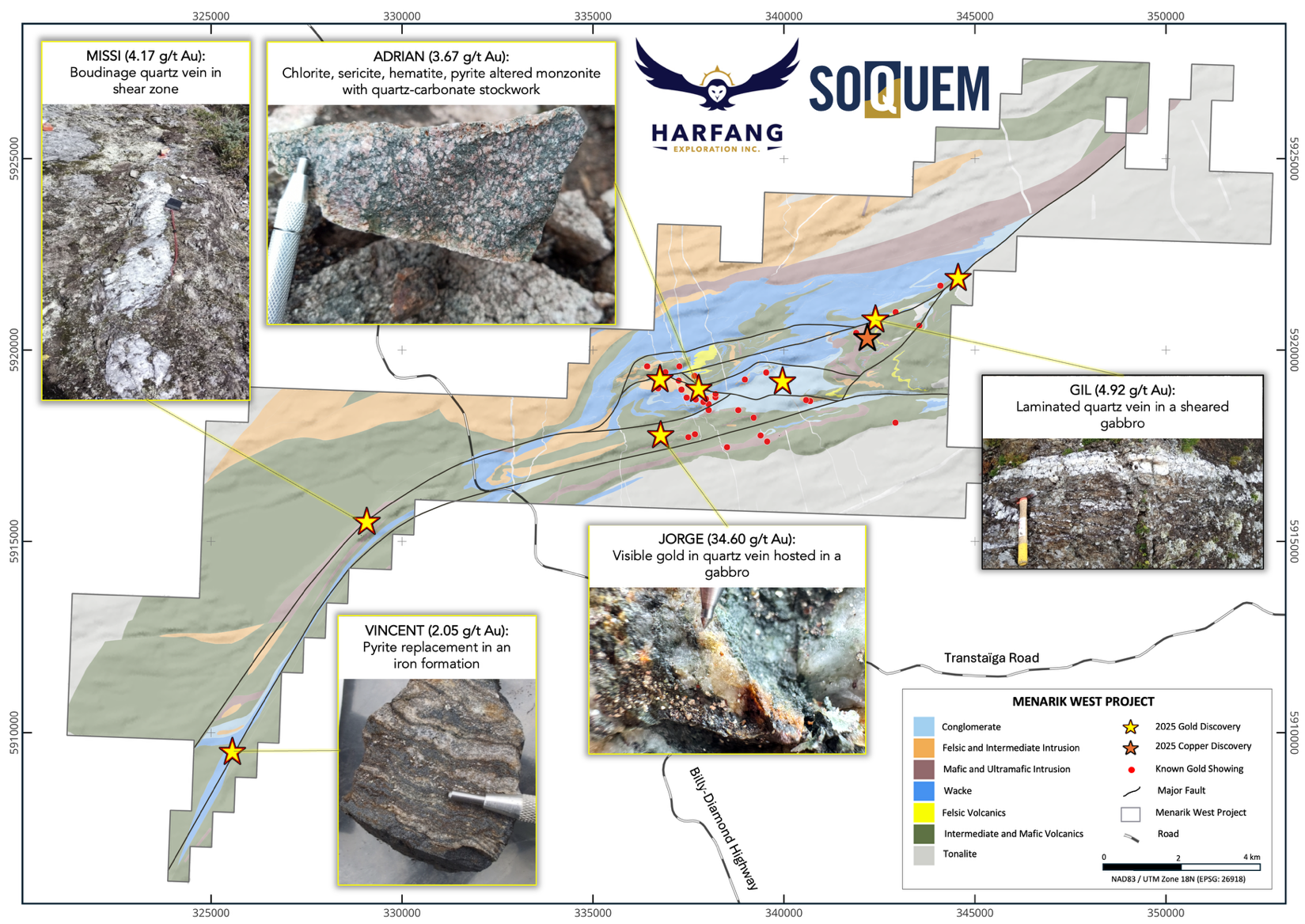 En mars 2025, Harfang a acquis 26 nouveaux droits d’exploration exclusifs (DEE) par désignation sur carte dans la portion sud-ouest de la Propriété. Dans le cadre du programme d’exploration estival, les Sociétés ont réalisé une première campagne de prospection sur ces nouveaux DEE, laquelle a mené aux découvertes Missi et Vincent, qui ont respectivement retourné 4,17 g/t Au et 2,05 g/t Au. Ces deux découvertes sont associées à des veines de quartz contenues dans des zones de cisaillement orientées NE, qui se prolongent vers l’est le long de corridors structuraux prospectifs.