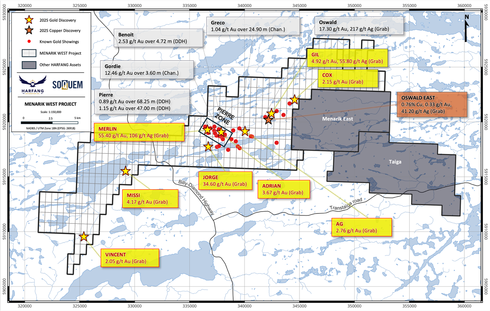 Rick Breger, président et chef de la direction de Harfang, a déclaré : « Harfang continue de se démarquer par l’efficacité de ses efforts d’exploration. Il s’agit de notre deuxième programme d’exploration au cours des six derniers mois ayant mené à des découvertes aurifères. Ici, au Québec, notre partenaire SOQUEM mérite pleinement nos félicitations ; son expertise approfondie en exploration et en géologie québécoise s’est révélée inestimable. L’été 2025 a marqué une avancée majeure pour Menarik Ouest : nous avons exploré de nouveaux secteurs et réalisé des découvertes aurifères à haute teneur, tant à l’intérieur qu’au-delà de la zone Pierre. »