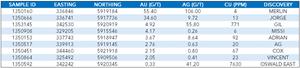 Les coordonnées sont présentées selon le système NAD83, zone UTM 18. Le lecteur est avisé que les échantillons choisis sont de nature sélective et ne reflètent pas nécessairement la teneur moyenne de la minéralisation sous-jacente.